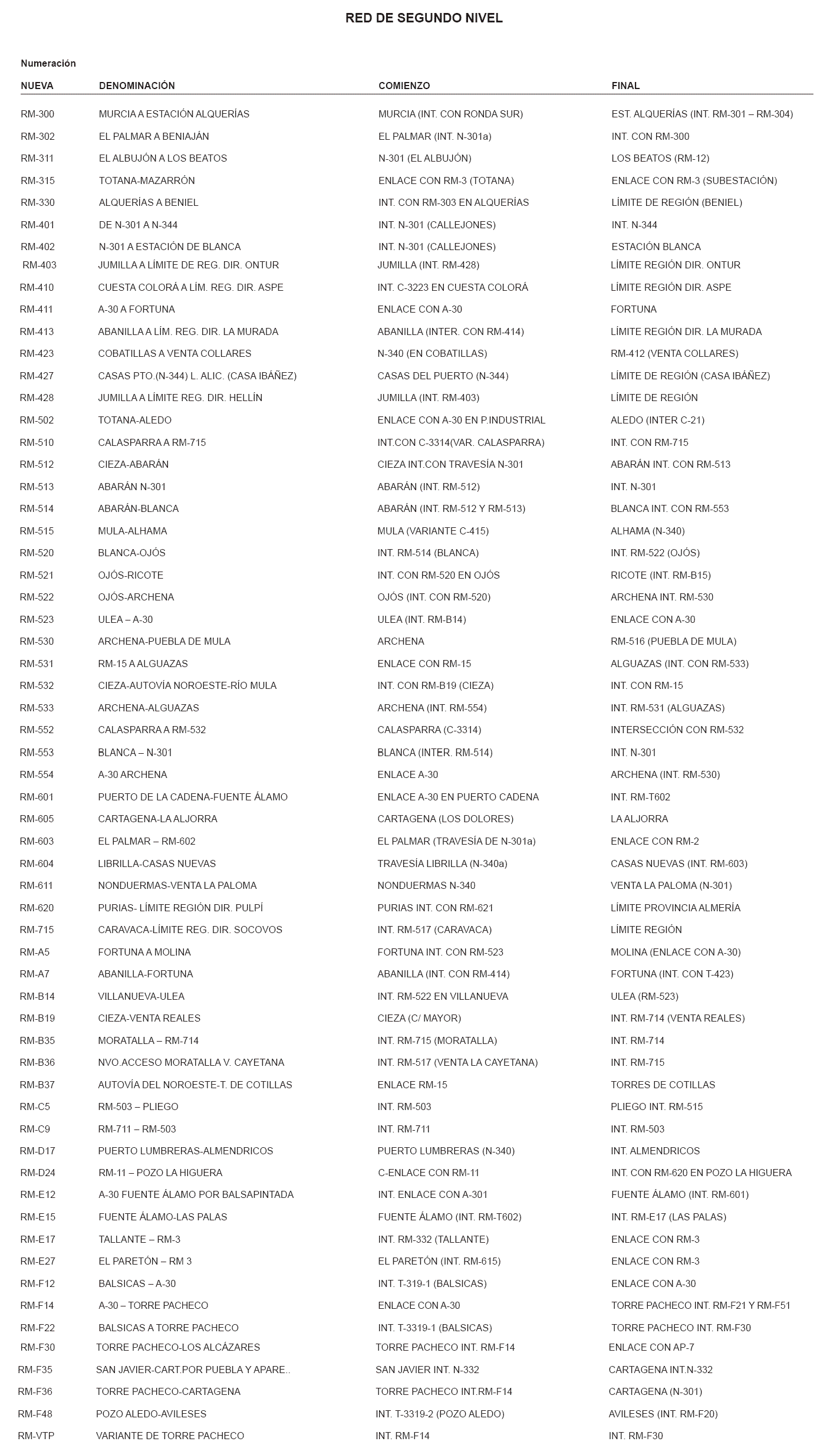 Las carreteras regionales cuya titularidad corresponde a la Comunidad Autónoma de la Región de Murcia se clasifican, según su función, dentro de las siguientes categorías: