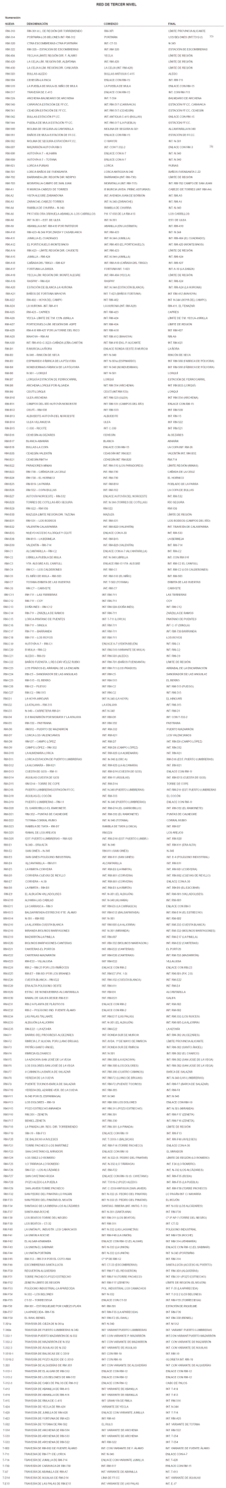 Asimismo contiene la denominación de cada carretera, su comienzo y su final.