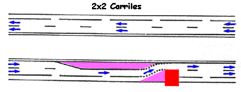 En general solo quedara abierto a la circulación un carril para el sentido considerado. El interior se cerrara normalmente a la circulación, bien porque sea el directamente afectado por las obras, bien porque se concentre toda la circulación en el carril exterior antes de cerrar este, desviándolo a un carril provisional situado, en correspondencia con la zona de obras, sobre el carril interior.