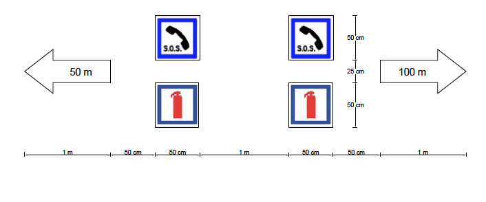 La presencia de un poste SOS se advertirá con los pictogramas de teléfono y extintor, debiendo indicar además, con una flecha, la distancia al poste SOS más próximo tanto en el sentido de la marcha como en el contrario.