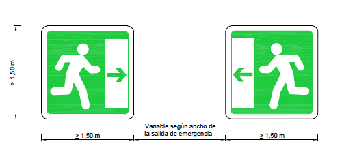 La señal de salida de emergencia sobre la puerta se colocará a una altura de 2,20 m en el hastial según las figuras 223 y 224 y será de 25 x 25 cm. Esta señal será fotoluminiscente e iluminada interiormente con la misma fuente que ilumina las bombillas del arco o de reborde de la puerta, y además será visible por ambas caras. En caso de que la puerta sea de más de 2 m de alto, esta señal de salida de emergencia se dispondrá 20 cm por encima.